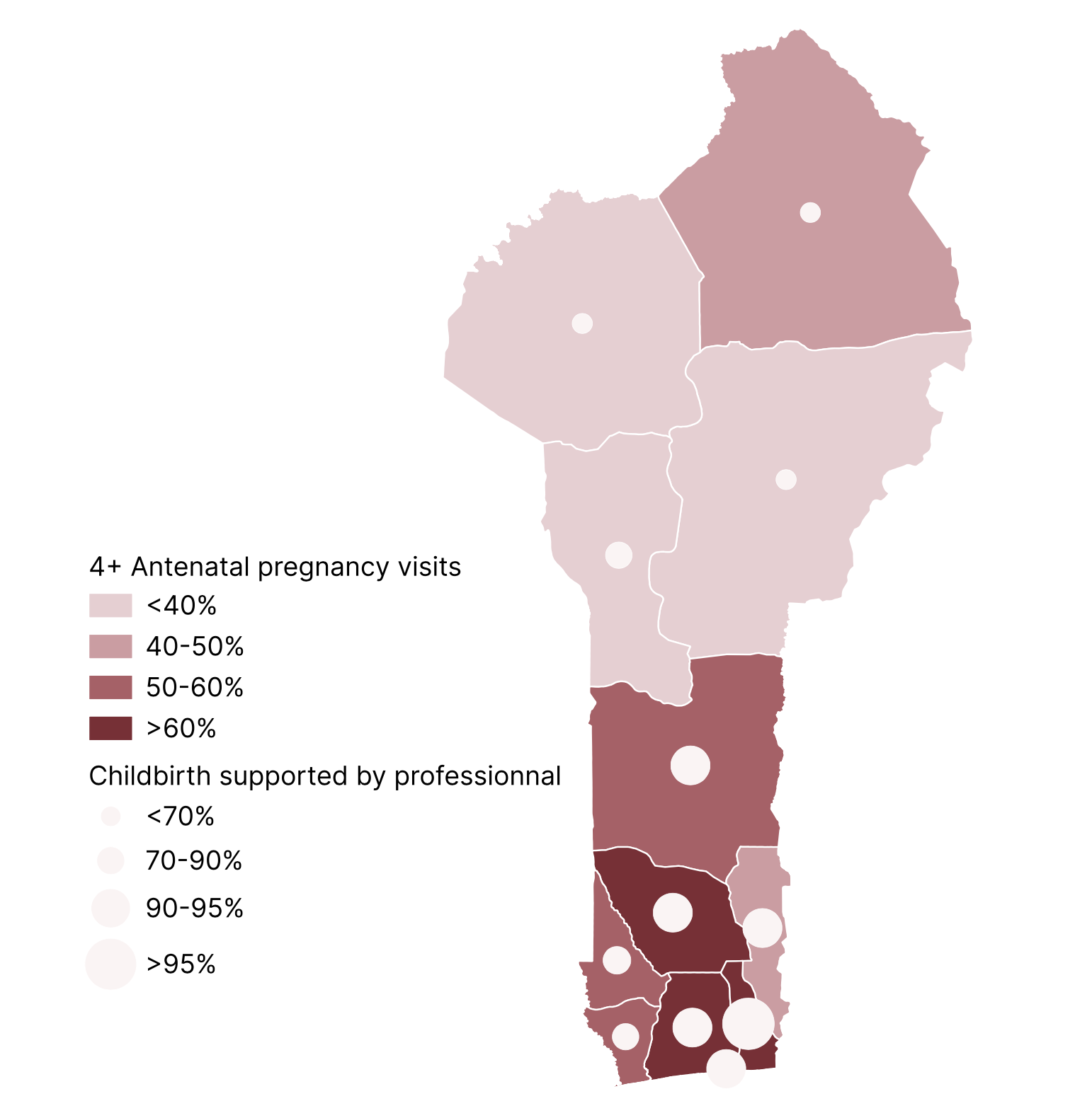 The map reveals significant regional disparities in antenatal care and professional support during pregnancy. In Atacora region, in the north of Benin, only 25.5% of women attended neonatal visits, with 66.7% receiving professional care during childbirth. In contrast, in Littoral (Cotonou), 81.8% of women had antenatal visits, and 93.8% were accompanied by professionals.